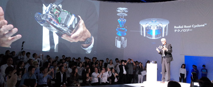 この日のためにUKから来日した創業者のジェームズ・ダイソン氏が「これまでのものとは、全く違うロボット掃除機です」と語る「360Eye」。約49億円の開発費と200人以上の研究者を投じ、16年もの開発期間を経て、満を持して打ち出した全世界注目の製品である。