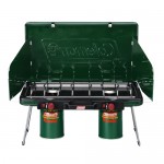 - パワーハウスLP ツーバーナーストーブ Ⅱ。持ち運びに便利なキャリーハンドル付きでスリムボディーの高出力LPツーバーナー。これがあればどんどん焼いてどんどん食べられる。