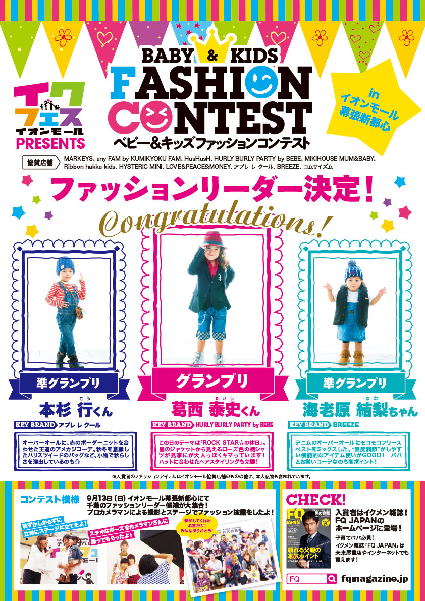 9月13日(日)『イクフェス イオンモール幕張新都心』内で開催された「ベビー&キッズファッションコンテストin幕張新都心」のグランプリおよび各賞を発表いたします!!