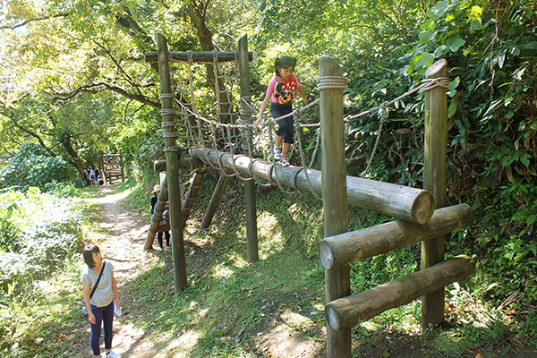 約1.5kmの山道に、木と紐でつくられた40ものアスレチック遊具を設置しているのが、「石川県森林公園」のフィールドアスレチック。自然あふれる環境の中、子供と一緒に大人もたっぷり楽しめる。「石川県森林公園」は総面積1,150ヘクタールにもおよぶ大規模な森林公園で、フィールドアスレチックの他にもゴルフやアーチェリー、テニス、バーベキュー、そして親子を対象とした自然体験教室や文化体験も行なうなど、学習の場としても広く活用されている。
