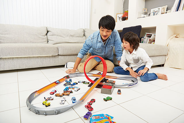 別のセットと合体させることで、遊びのバリエーションがグンと増えてしまうのが、この「6つのコースで遊べる!スーパーセット」の魅力。例えば2つのエレベーターがついた「オートリフト・スピードウェイ」を使えば、さらに立体的なアクションが楽しめるコースに。つなぎ方は工夫次第でさまざま。パパとあれこれ考えながらコースを組み立てるところから、すでにエキサイティングなホットウィール遊びは始まっている! 完成したコースをお気に入りの1台が疾走する姿に、喜びと興奮もひとしおだ。
