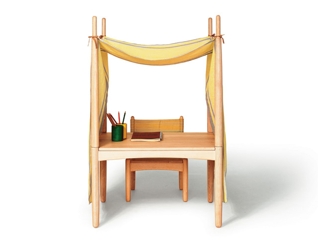 座って勉強するだけでなく、出たり入ったり、急に飛び出したり……子供の柔軟な発想に対応し、“自分だけの空間”を目指して作られたデスク。まるで秘密基地のようなデスクは、豊かな想像力を育んでくれそう。天蓋を取り外して使うことも可能だ。