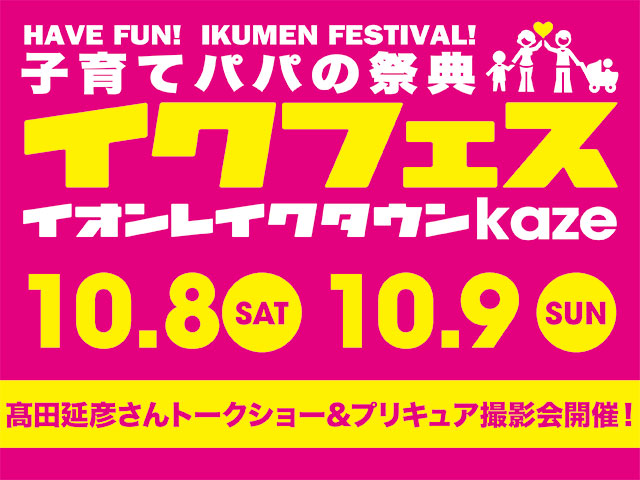 雑誌「FQ JAPAN」主催のビッグイベント『イクフェス』を、あなたの街の「イオンモール」とのコラボバージョンで開催! 気になる最新育児アイテムの展示ブースや、大人気のイクメン+ベビー&キッズ・ステージ、イクメンスキルをアップするワークショップなど、パパの育児がもっと楽しくなる、そしてちょっぴりためにもなるコンテンツが勢ぞろい!