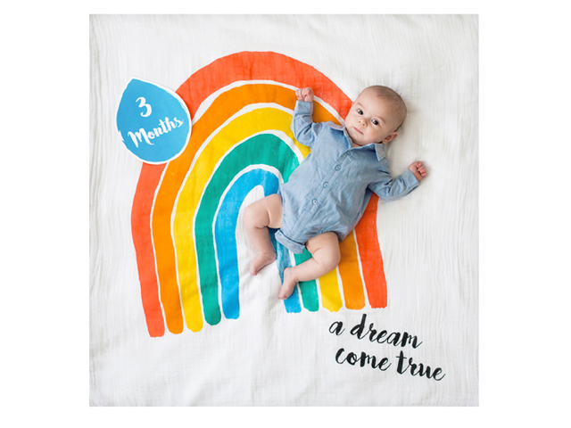 上質なモスリンコットンのおくるみに、月齢の書かれた14枚のカードがセットになったカナダ発のアイテム。広げたおくるみの上に赤ちゃんを寝かせて、付属のカードと一緒に撮影するだけで、可愛くて子供の成長記録にもなる写真が撮れると注目を集めている。