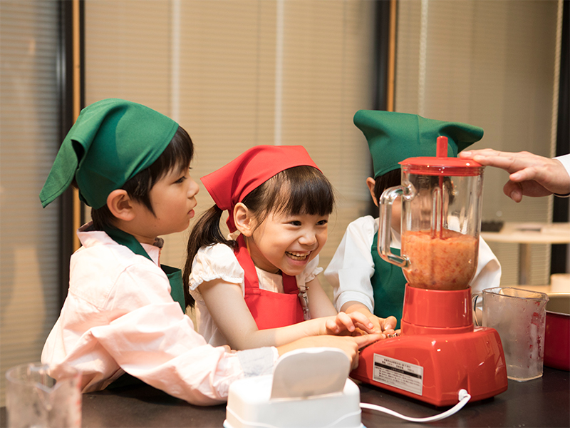 話を聞いたあと、子供たちはオスミックトマトを使ってトマトジュースを作ったり、さまざまなトマト料理の試食をしたりする中で、トマトの新しい魅力を発見していく。