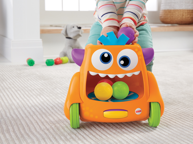 見た目のインパクト大! 子供が大好きなカラフルなモンスター「おいかけて!ズーム&クロール・モンスター」は、生後9ヵ月頃から子供の成長に合わせて2通りの遊び方が楽しめる。