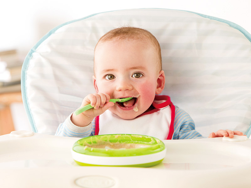 赤ちゃんをひざに抱き少し後ろに傾けるようにすると食べさせやすくなる。