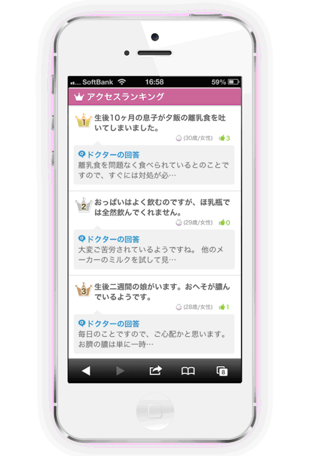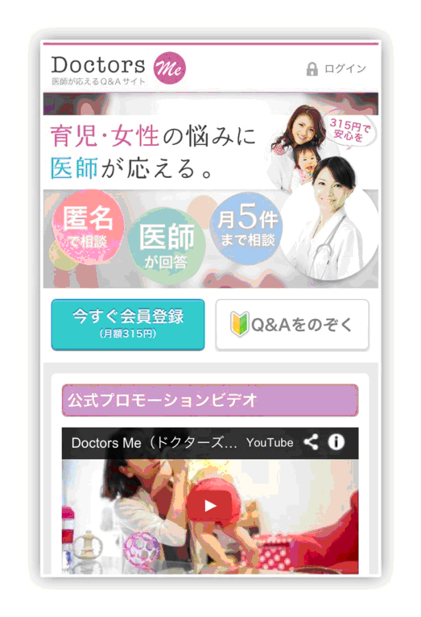 ママのために開発された「Doctors me」は、出産経験のある女性医師が直接悩みに答えてくれるQ&Aアプリだ。匿名サービスで、相談時にはスマホで撮影した画像を送信することもでき、平均30分で返事をもらえる優れもの。月額315円で相談し放題なので、いつでも気兼ねなく正確なアドバイスを求めることができるだろう。