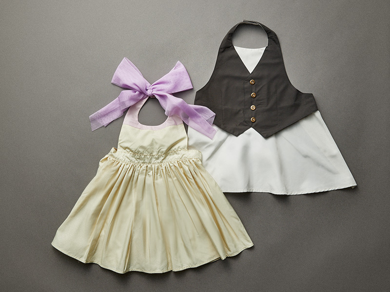透湿性・撥水性・撥油機能を兼ね備えた汚れに強い生地を使用。お食事タイムをよりハッピーにするスタイリッシュで高機能なお食事エプロン。後ろの首元のリボンがポイントとなる「ブーケ」(写真左)は、ボリューミーなワンピース風で女 の子の可愛らしさを引き立てる。男の子にはギャルソンボーイをモチーフにした デザイン(写真右)で凛々しく。出産祝いなどプレゼントにも最適。