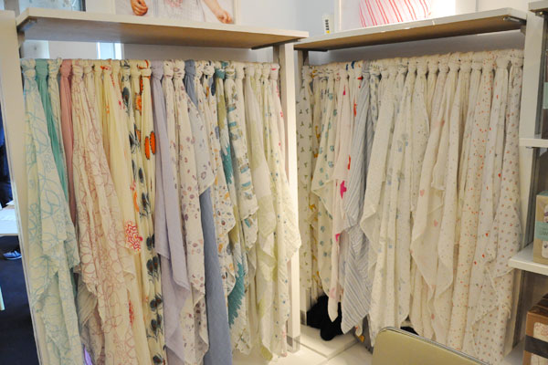 定番のモスリンラップがズラリ。ベビーカーにかけて日よけや虫除けに。おうちの中やお出かけ先での遊び場として、オムツ替えマットとして。