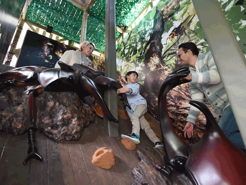 ほかにも、「森」をコンセプトにリニューアルした「モビパーク」では、昆虫サイズに小さくなって大木の中を冒険しているような、「森感覚アスレチック DOKIDOKI」が新登場! 子供と等身大のカブトムシやクワガタ、リアルなスズメバチなどの39のアスレチックを攻略しよう!