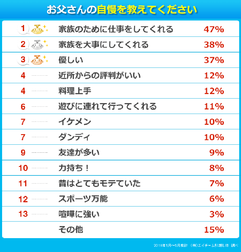 お父さんの自慢はなんですかという問いでは、1位が「家族のために仕事をしてくれる」。次いで「家族を大事にしてくれる」だった。子供たちのために、一生懸命頑張ってくれるお父さんの姿。一家の大黒柱としての責任を持つ姿と、家族への愛情が伝わっているのだろう。子供としてそんなお父さんを誇りに思っていることがわかる。
