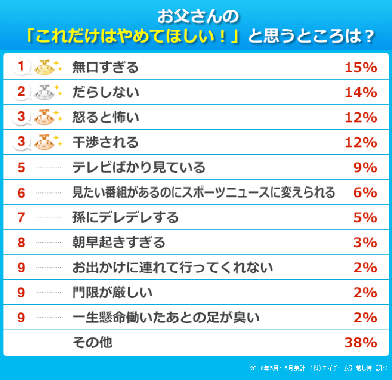 さらに「イケメン」、「ダンディ」という回答があることから、やはりいくつになってもイケてるお父さんは自慢なのがわかる。9番目の「友達が多い」という回答からは、父親であっても一個人として、自分の人間関係を充実させていることを重視している点が伺える。人間的に魅力がある父親というのが誇らしいのだろう。