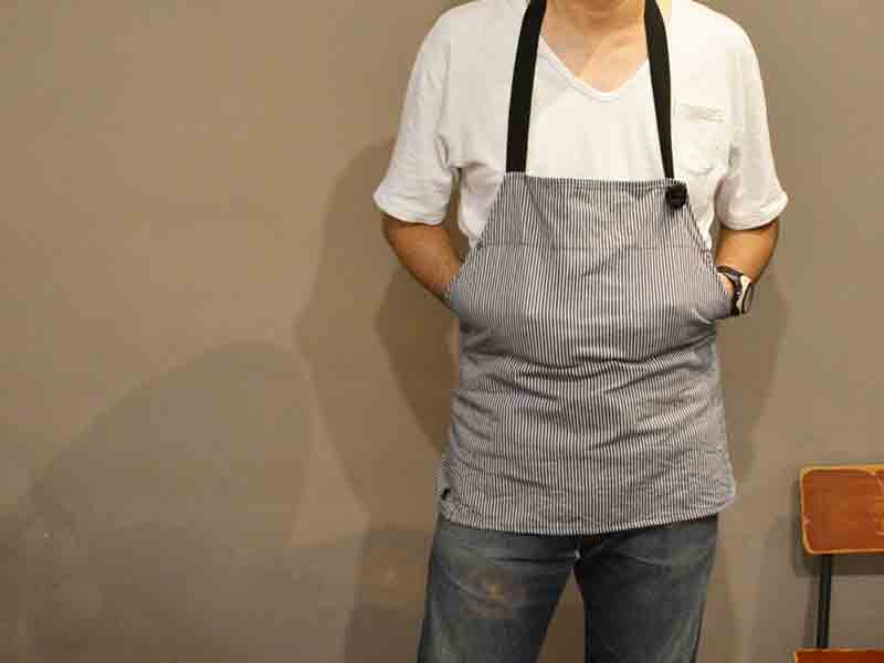 汚れから身を守るエプロンとしての機能に特化し、デザインは極限までシンプルに。丈は短めで動きやすく、ヒッコリーストライプ柄の国産生地は、使うほど味が出て愛着が湧く素材だ。