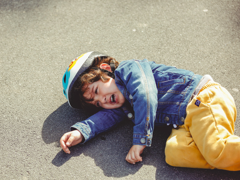 「駐輪中、目と手を離した隙に子供を乗せたまま自転車が転倒。ヘルメットをしていたが、ヘルメットがベッコリと凹んでしまった。これがわが子の頭がだったらと思うと…。今までヘルメットを着用しない日もあったが、その日以降必ず着用しています。」