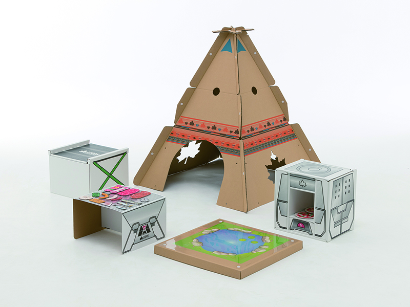 BBQや池での魚釣りなど、野性味あふれるキャンプごっこが室内で満喫できる、折って組み立てる美粧ダンボール製LOGOSのキャンプ道具。ティピーテント、スツール、BBQ用ピラミッドグリル、かまどがセット。遊びの後は勉強机と本棚に変身! ¥9,300