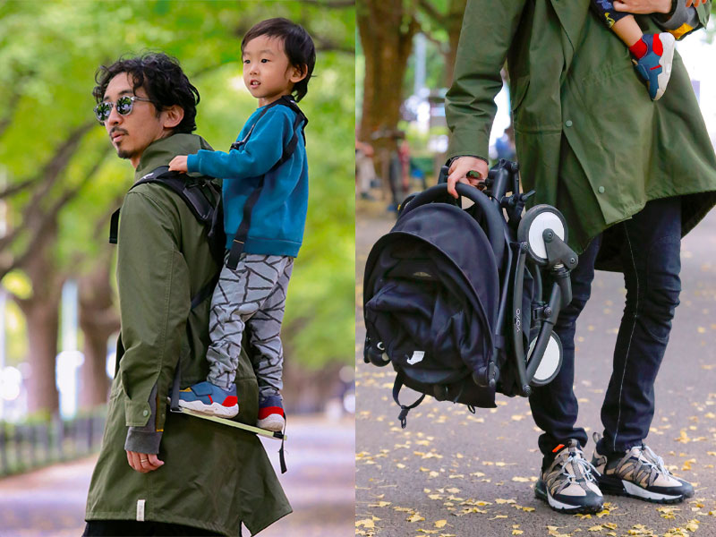 アメリカ発、子供を立たせたまま背中全体で背負うことができるおんぶ紐。パパが装着するキャリアの先端にアルミ製のバーが付いており、そこを足場に子供が直立する仕組み。「抱っこや肩車に比べ、パパも子供も両手が自由になるので、活動の幅が広がります。アウトドアやレジャーの時というよりも、普段の買い物や散歩の時によく使っています。これのお陰で何気ないお出かけが最高のアトラクションになりますからね。このままバスなどに乗ると、高い確率で年配の方々から「あたしの時はこんなのなかったわ~」と声をかけられますよ」。