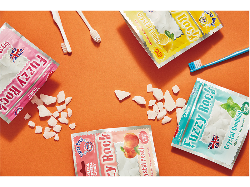 イギリスで人気を博したキシリトール100%のキャンディ「ファジーロック」。キシリトールのみだから、歯を磨いた後のご褒美におやつとしてあげたり、虫歯の心配なく寝る前に食べさせたりできる。王道のクールミントに加え、キッズに人気のピーチ、レモン、バブルガムの4種の味を用意。