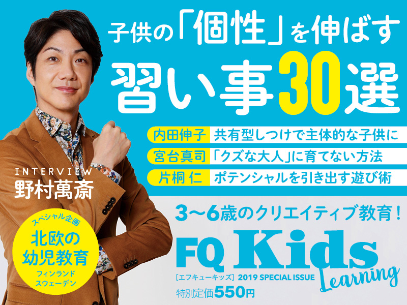 FQから幼児教育に特化した特別版『FQ Kids』発売! 3~6歳のクリエイティブ教育、子供の「個性」を伸ばす習い事30選、自由な発想力を伸ばす新感覚トイ、豪華俳優陣のインタビューほか。表紙は、野村萬斎さん!