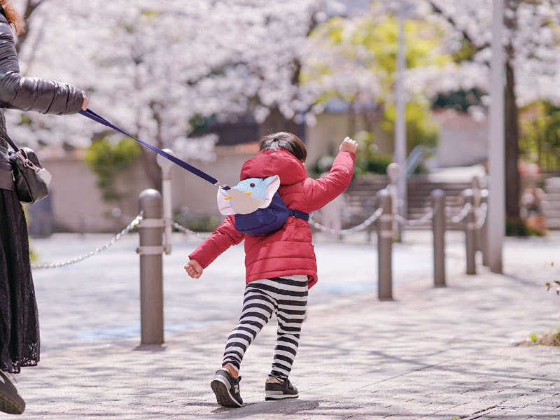 「セーフティーリュック」本体の中心部分にはリード紐が取りつけられ子供が転びにくい設計を採用。リード紐部分は、5才児の平均体重(20.1kg)の2倍の引張力に耐えられる。家庭用だけでなく、出産祝いにも最適。