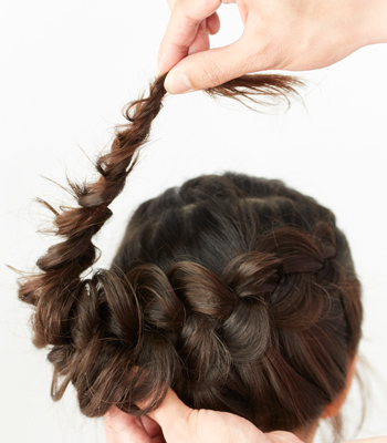 4.前部分のみつあみをねじり、毛先をピンで固定します。
