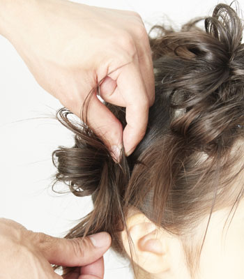 1.髪の毛全体を、ギザギザに3つに分けて結びます。
