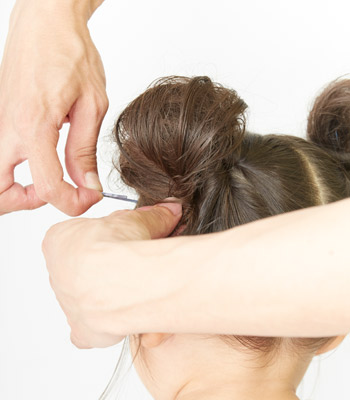 5.逆毛を立てた毛束を、くるっとまとめ、毛先をピンで留めます。