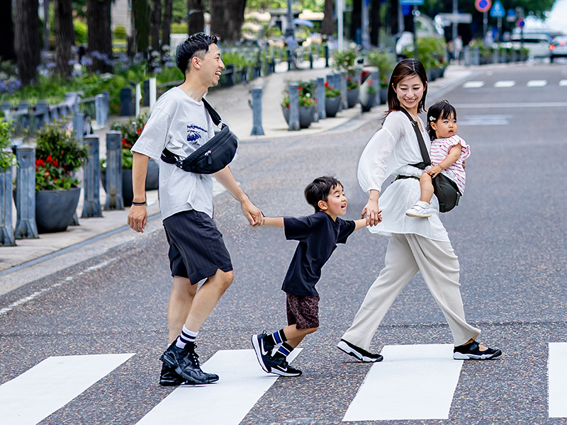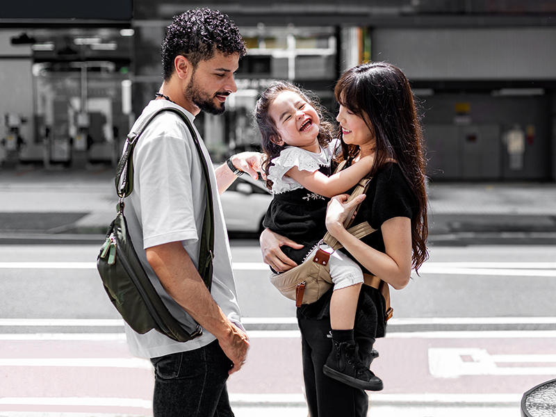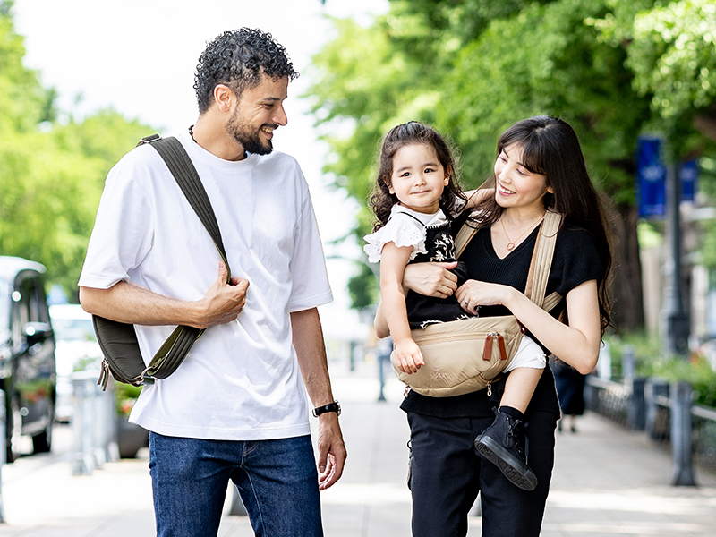 「歩育」という新しい子育てを提唱する抱っこバッグ。ミニマルでジェンダーレスなデザインは、誰でもどこへでもお守りのように毎日身に着けられるコンパクトさが魅力。対面と前向きの2種類の抱っこが可能。