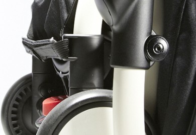 3つ折りの折りたたみ形状は、幅18cm、高さ52cmと、ベビーカーとしては史上最高クラスのサイズに。これによって飛行機の手荷物収納スペースにもスッポリ。ショルダーバックのように肩にかければ、ママでも軽々と持ち運べる。